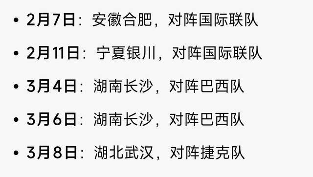 2月、3月的五场热身赛时间如下: